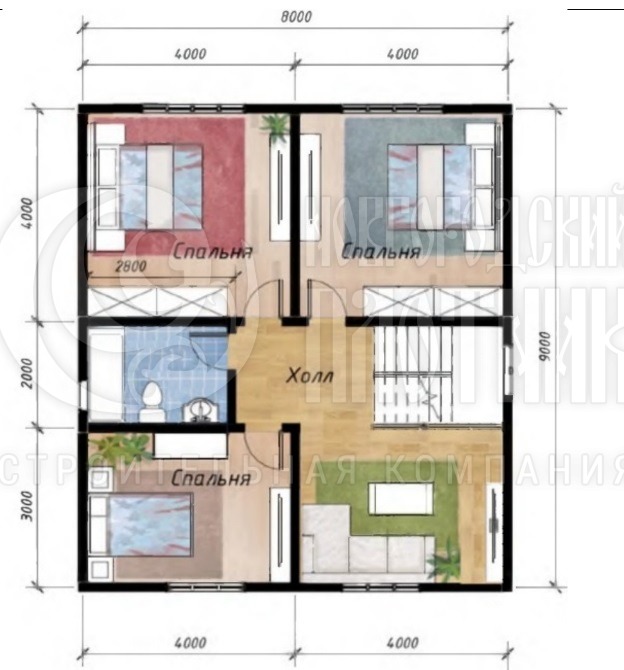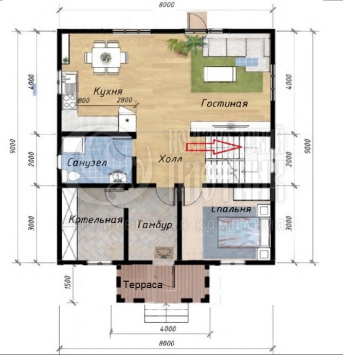 Каркасный дом 8х9м с крыльцом (проект Д-19)