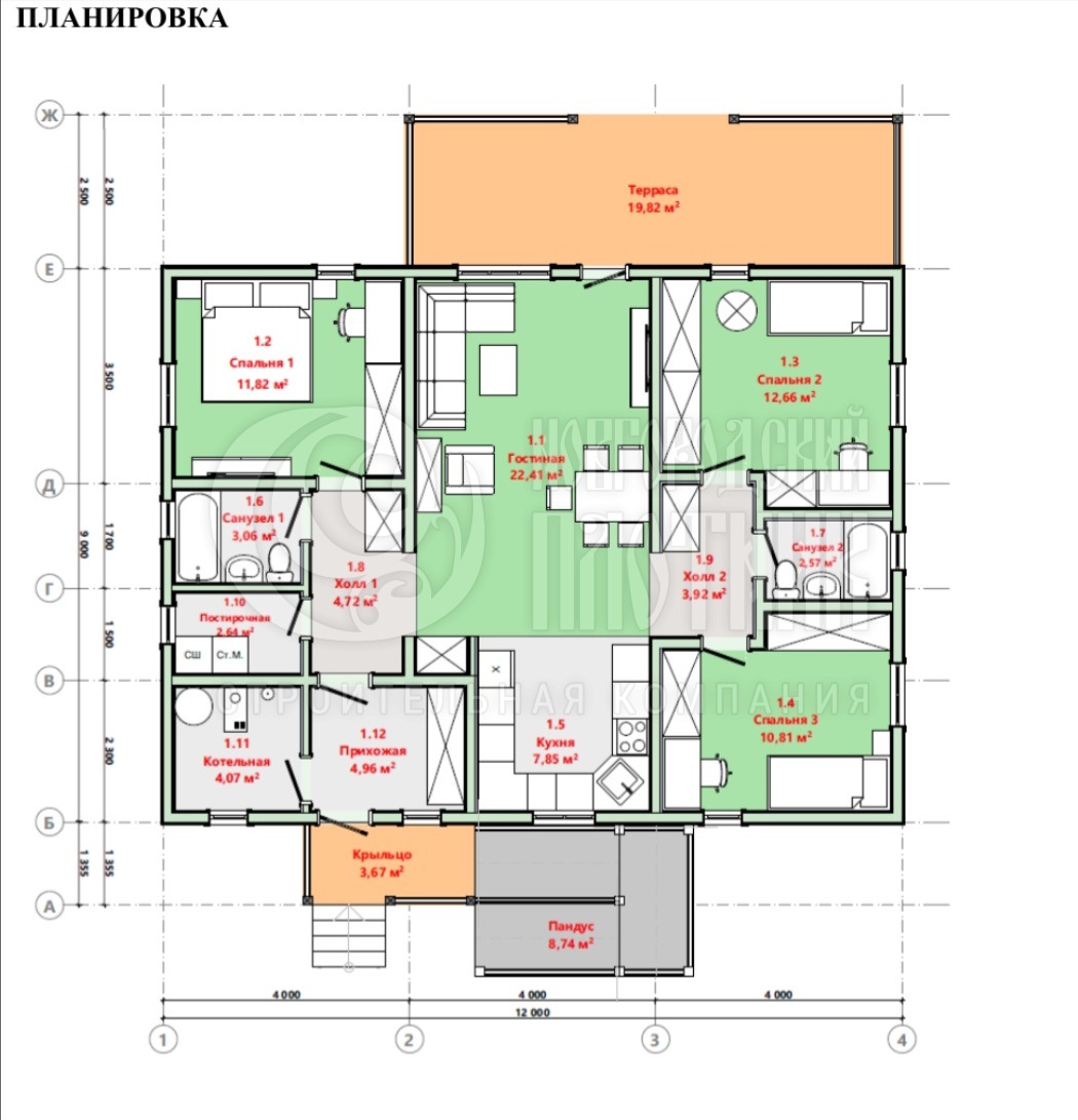 Одноэтажный каркасный дом 9х12м с пандусом (проект Д-3)
