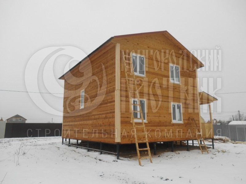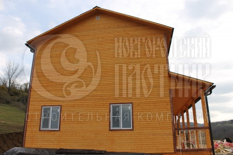 Каркас, стойки (45×95мм\ 45×145мм) строганые камерной сушки, фронтоны обиваются снаружи по контробрешетке 20×40мм (вентилируемый фасад) сухой вагонкой (толщина вагонки 16мм);
