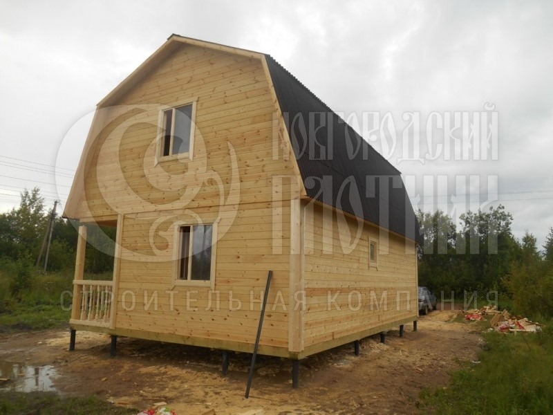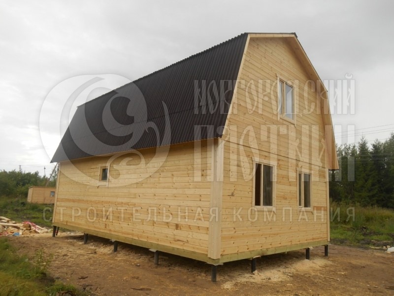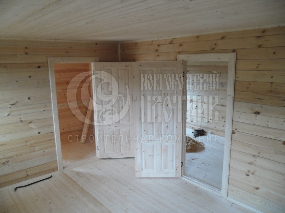 Стены каркаса, ригеля, укосины, стойки — строганая доска 45×145мм камерной сушки с шагом 58-59см обиваются снаружи по контробрешетке 20×40мм (вентилируемый фасад) и внутри по стойкам вагонкой камерной сушки (толщина вагонки 16мм). Перегородки каркаса, ригеля, укосины, стойки — строганая доска 45×95мм камерной сушки с шагом 58-59см без утеплителя, обшиты вагонкой камерной сушки (толщина вагонки 16мм). Утепление стен и потолка — Роквул толщиной 150мм с пароизоляцией (внутри) и ветрозищтой (снаружи);