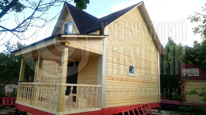 Деревянная: ступени выполняются из половой доски 36мм, тетива — из бруса 90×140мм, перила и балясины точеные;