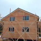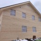 В апреле 204г завершилось строительство каркасного дома по проекту Д-24. Каркас стен \выполнен из сухой строганой доски, снаружи обшит имитацией бруса (толщина имитации 19мм), внутри вагонкой и частично имитацией, потолки вагонкой (толщина вагонки 16мм). Окна ПВХ выполнены под заказ и предоставлены заказчиком. Кровля металлочерепица. Во фронтонах для подкровельной вентиляции установлены решетки. Лобовая выполнена из двойной доски. По проекту дом двухэтажный, в данном построенном доме заказчик уменьшил второй этаж до полутораэтажного (простенок 1,6м). Дополнительно выполнено антисептирование основания, установлены вытяжки в санузлах.