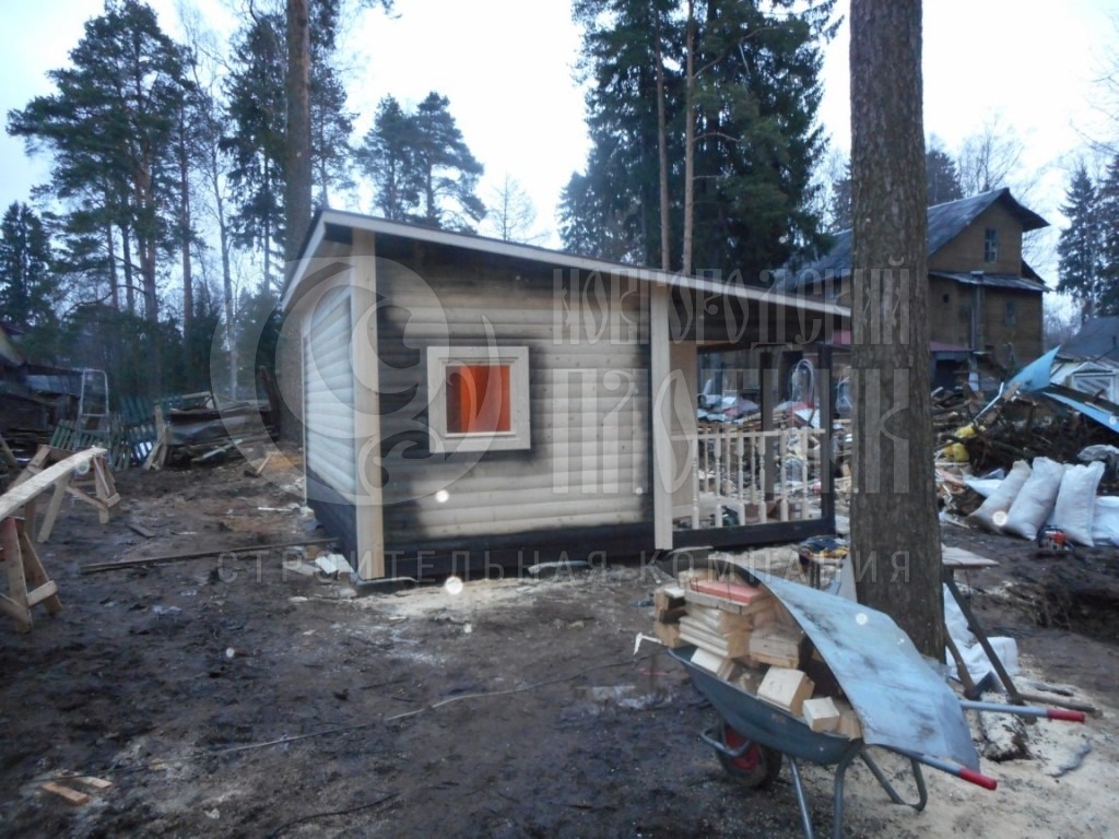 Одноэтажная баня из профилированного бруса 90*140мм размером 6х3м и террасой 6х2м построена в пос.Песочный на основе проекта бани Б-9. Крыша бани изменена на односкатную. Не все стены еще окрашены, но задумка Заказчика уже понятна. Темный цвет бани с белой обналичкой (окна, двери, углы бани) смотрится очень гармонично.