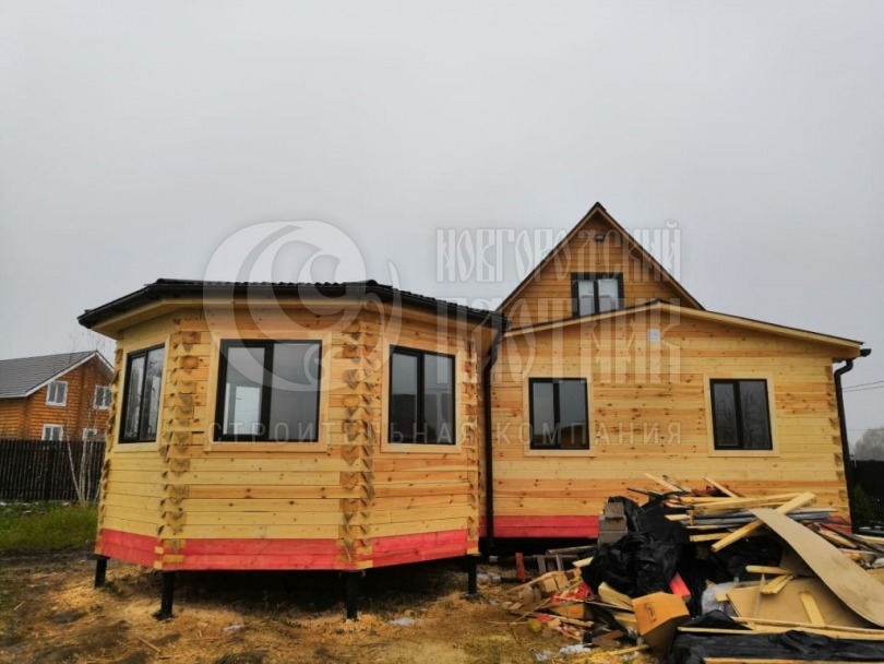 Строительство пристройки и хозблока 3х4,5м завершилось в ноябре 2018г. Угловая пристройка с эркером построена вплотную к дому 6х4м, построенного нашей компанией в 2017г. Стены выполнены из профилированного бруса 140х140мм (профиль прямой). Окна - деревянные двухкамерные стеклопакеты (коричневые). Покрытие крыши - ондулин.