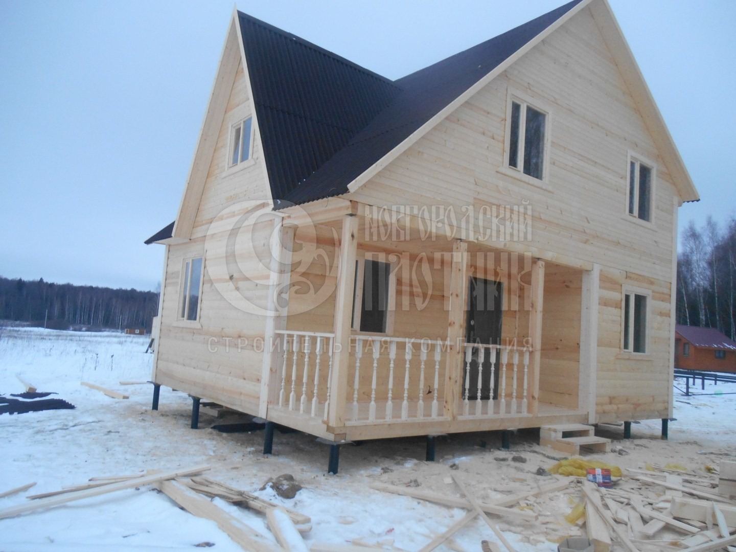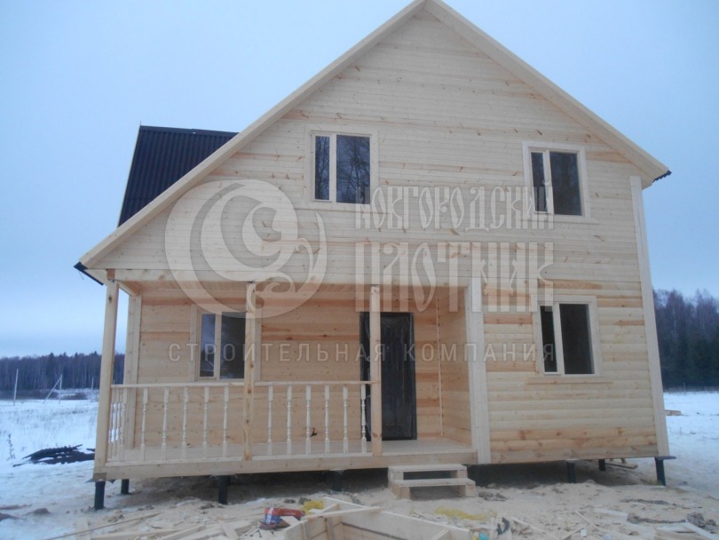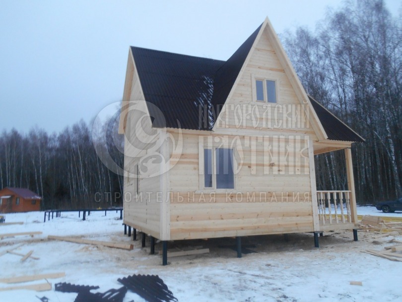 Деревянный дом из бруса, размером 6х8м построен по проекту Д-22. Первый этаж выполнен из строганного профилированного бруса 140х140мм, мансарда каркасно-щитовая с утеплением минватой Изовер (толщиной 100мм). Из проекта убран балкон.