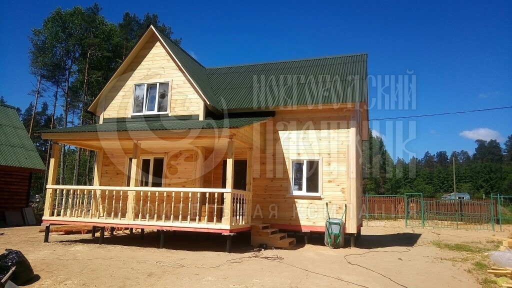 Строительство дома завершилось в июне 2017г. в поселке Мичуринское. Стены дома выполнены из профилированного бруса 190х140мм (ШхВ). Дом построен на основе проекта Д-88. Высота 1-го этажа 2,4м, второго 2,3м, простенок 1,5м.