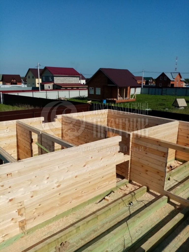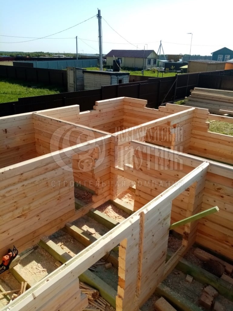 В сентябре 2019г. завершилось строительство брусового полутораэтажного дома построенного по проекту Д-34. Стены первого и второго этажей выполнены из профилированного бруса 140х140мм (прямой профиль), перегородки из профилированного бруса 90х140мм. Покрытие крыши металлочерепица Монтеррей.