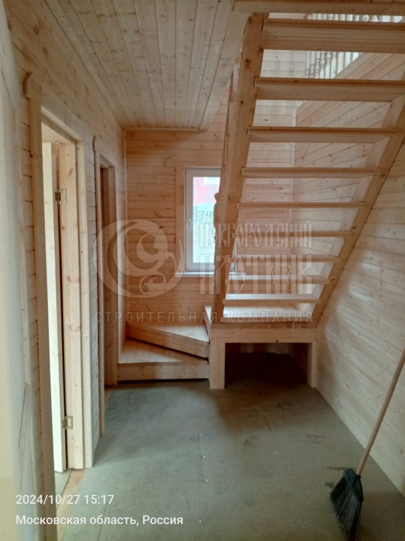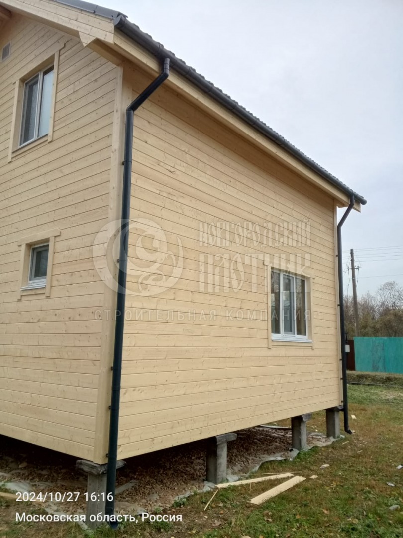 В октябре 2024г. завершилось строительство каркасного дома по проекту Д-22. Каркас дома 150мм выполнен из сухой строганой доски, снаружи обшит имитацией бруса, внутри вагонкой. Утепление стен - Роквул 150мм, полы и потолки утеплены в 200мм. Окна ПВХ двухкамерные. Кровля металлочерепица (серого цвета).