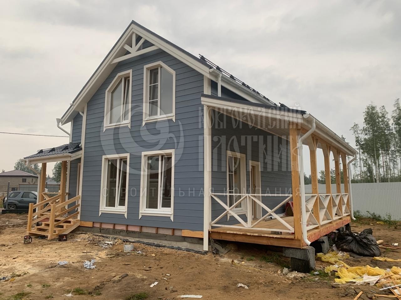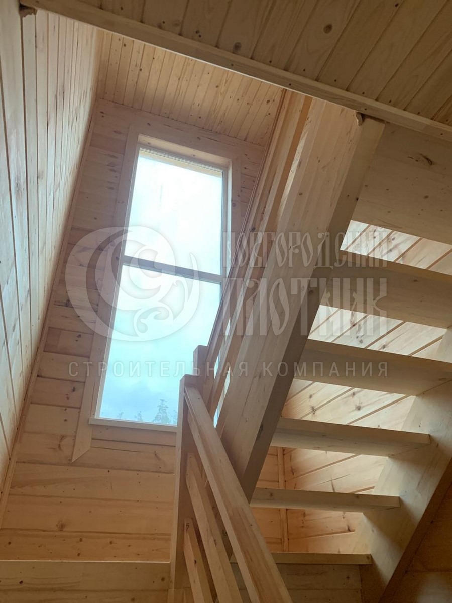 В августе 2020г. завершилось строительство каркасного дома по проекту Д-100. Каркас стен снаружи и внутри обшит имитацией бруса, потолки вагонкой. Утепление стен, полов и потолков - каменная вата Роквул толщиной 200мм. Окна ПВХ выполнены под заказ. Кровля металлочерепица Монтеррей (цвет серый).