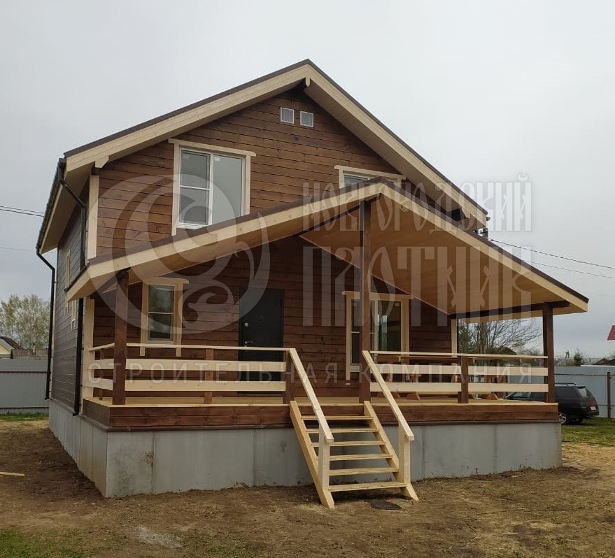 В мае 2022г. завершилось строительство каркасного дома на основе проекта Д-34. Балкон и терраса зашиты, в ходе строительства заказчиком была добавлена открытая терраса. Каркас стен толщиной 150мм снаружи и внутри обшит имитацией бруса, потолки подшиты вагонкой 16мм. Кровля металлочерепица. Окна ПВХ двухкамерные, часть окон выполнены под заказ и предоставлены заказчиком. Пристройка террасы, установка печи, покраска дома - выполнены отдельно, по договоренности с бригадой в процессе строительства.
