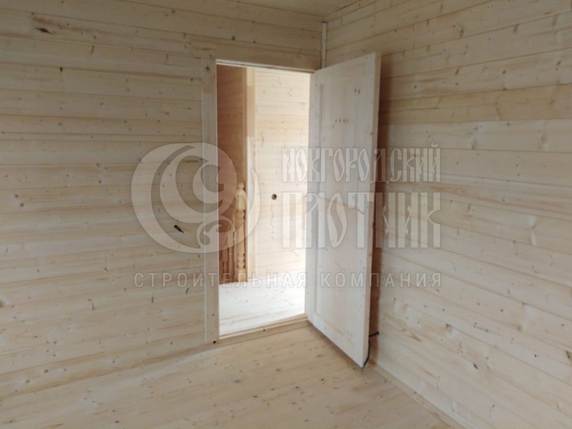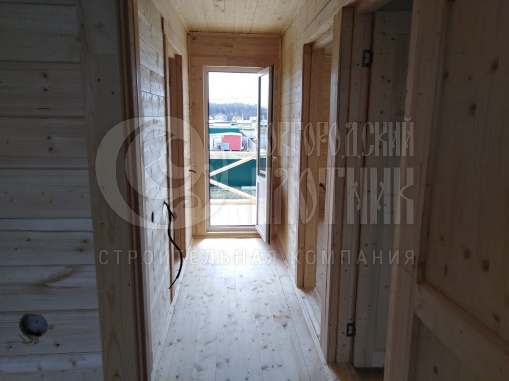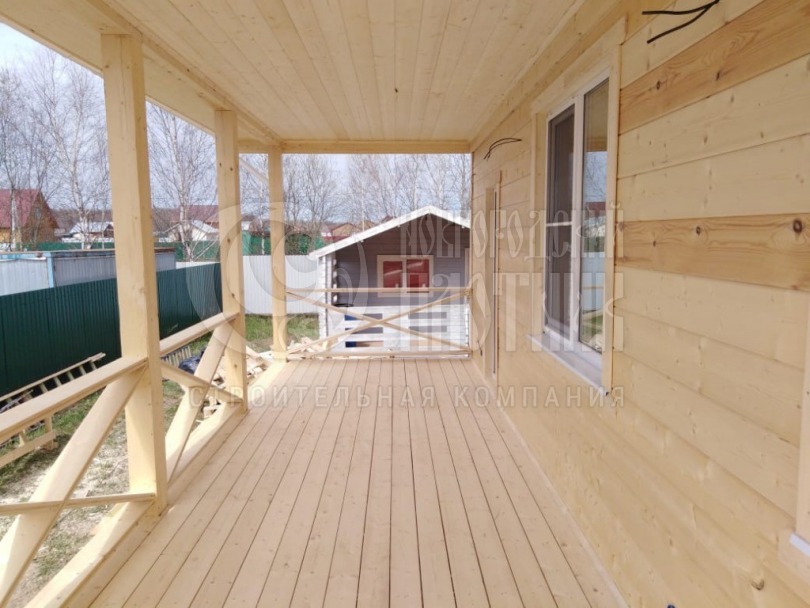 В мае 2020г. завершилось строительство очередного дома по самому популярному проекту Д-34. К дому добавили просторную террасу, зашили крыльцо, тем самым увеличив полезную площадь дома. Каркас стен толщиной 150мм снаружи и внутри обшит имитацией бруса, потолки вагонкой. Утепление стен, полов и потолков - каменная вата Роквул толщиной 150мм. Окна ПВХ выполнены под заказ. Кровля металлочерепица.