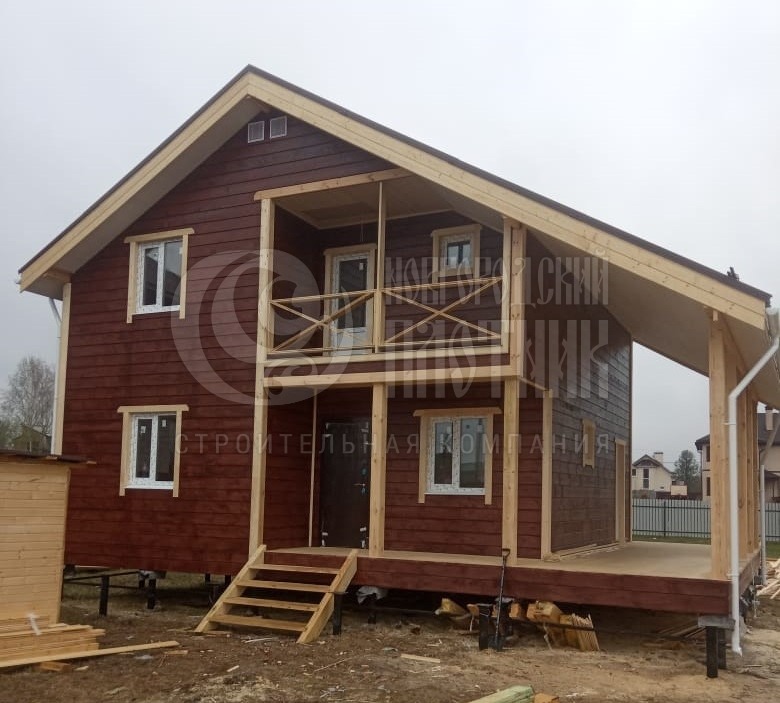 В мае 2021г. завершилось строительство каркасного дома на основе проекта Д-34. каркас стен снаружи и внутри обшит имитацией бруса, потолки вагонкой. Утепление стен - каменная вата Роквул толщиной 150мм, полов и потолков - Роквул 200мм. Кровля металлочерепица.