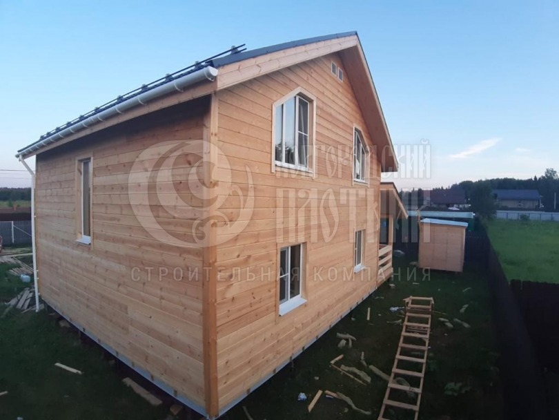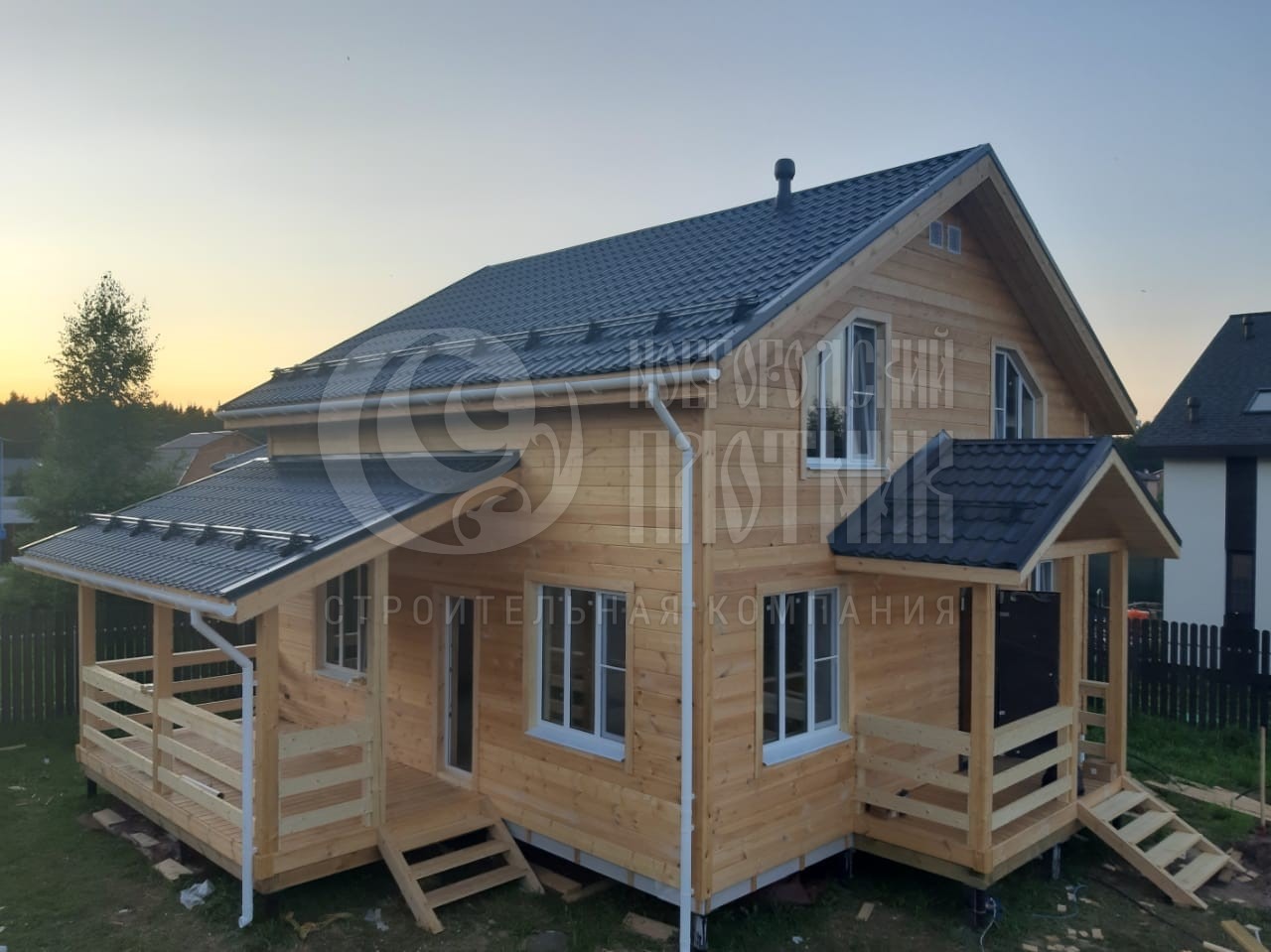 В июле 2021г. завершилось строительство каркасного дома на основе проекта Д-34. В проекте изменили планировку, зашили крыльцо и балкон, добавили отдельную террасу и крыльцо. Каркас стен снаружи и внутри обшит имитацией бруса, потолки вагонкой. Утепление стен, полов и потолков - каменная вата Роквул толщиной 200мм. Окна ПВХ выполнены под заказ. Кровля металлочерепица.