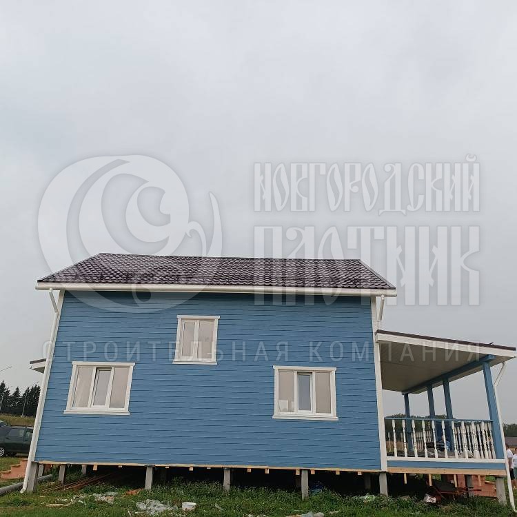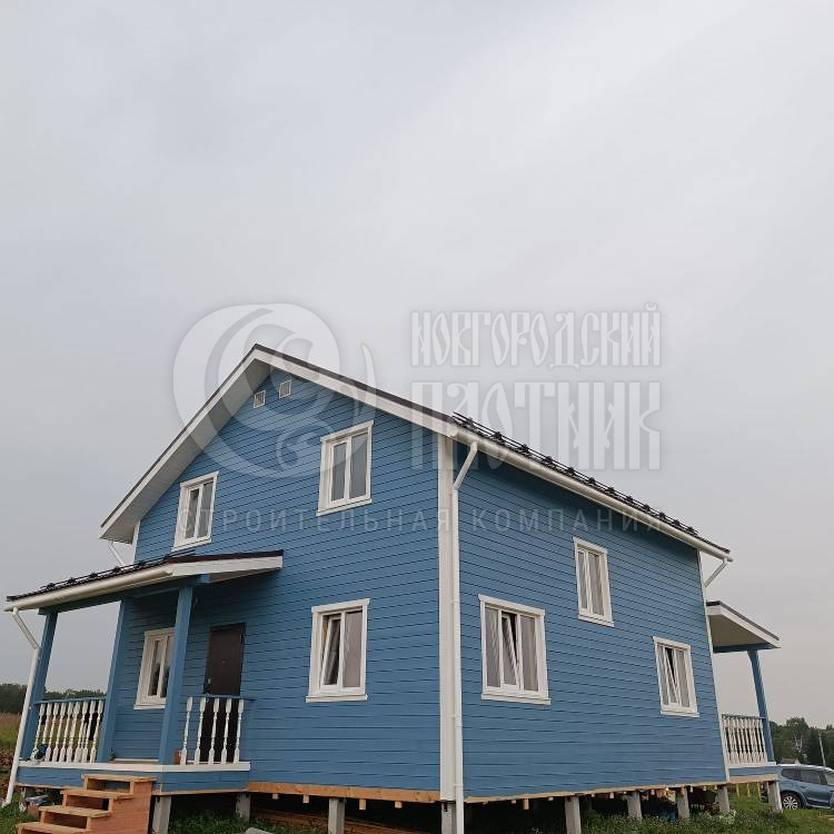 В июле 2023г завершилось строительство каркасного дома по проекту Д-19. В проект добавили открытую террасу 3х8м позади дома. Каркас стен выполнен из сухой строганой доски, утепление стен и потолков - Роквул 150мм, полы 1-го этажа утеплены в 200мм. Окна ПВХ двухкамерные. Кровля металлочерепица.