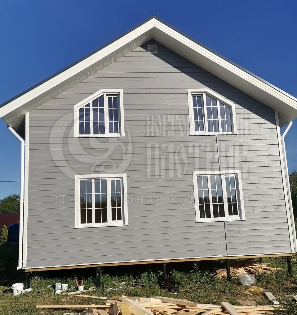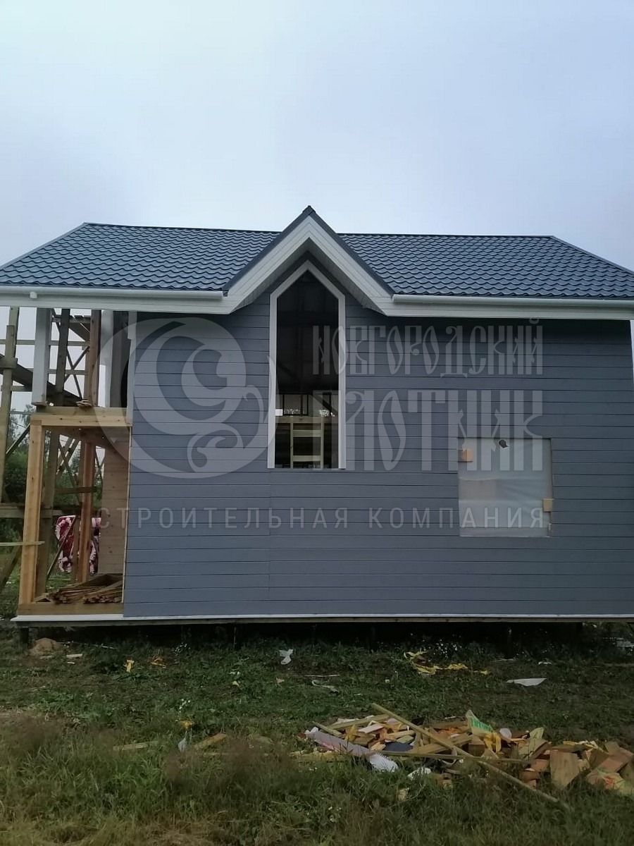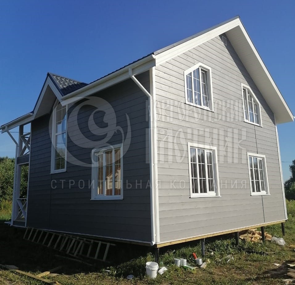 В августе 2020г. завершилось строительство каркасного полутораэтажного дома по проекту Д-72. Каркас стен 150мм снаружи и внутри обшит имитацией бруса, потолки вагонкой. Утепление стен - каменная вата Роквул 150мм, полов и потолков - Роквул 200мм. Окна ПВХ выполнены под заказ. Кровля металлочерепица Монтеррей (серого цвета).
