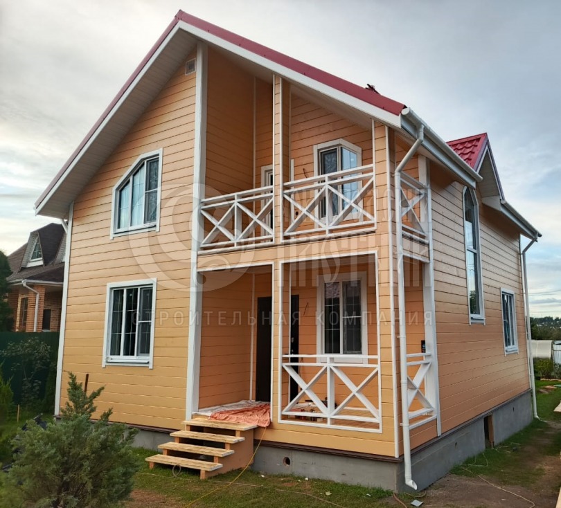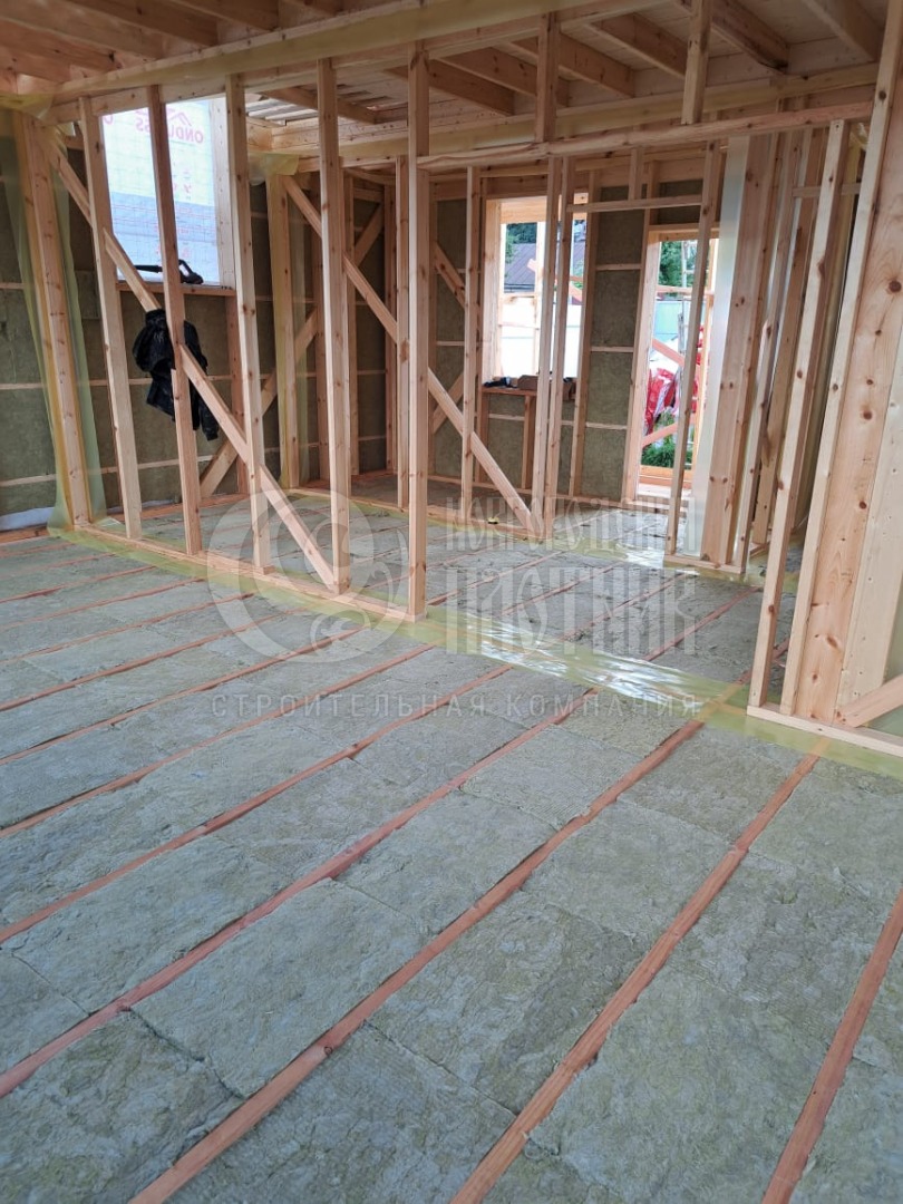 В августе 2025г. завершилось строительство каркасного дома по проекту Д-72. Сухой строганый каркас 150мм снаружи и внутри обшит имитацией бруса, снаружи имитация покрашена в заводских условиях. Потолок первого этажа без подшивки, второго этажа обшит вагонкой. Утепление стен, полов и потолков - Роквул 150мм. Окна ПВХ выполнены под заказ. Кровля металлочерепица. Дополнительно выполнено антисептирование основания, проложена сетка от грызунов.