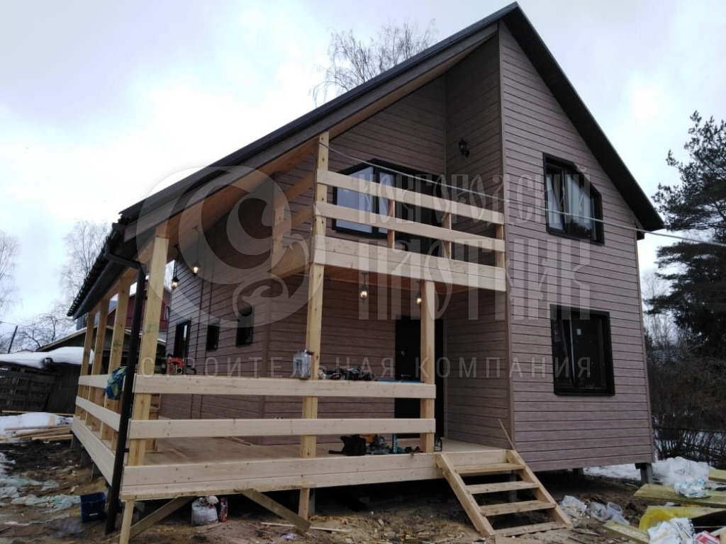 Строительство дома завершилось в марте 2019г. Размер дома изменен на 7х9м (был 8х8м), добавлена терраса вдоль дома шириной 2м под общей крышей. Снаружи каркас обшит ОСБ 9мм (сайдинг предоставлен Заказчиком), внутри имитацией бруса. Утепление стен, полов и потолков - вата Кнауф толщиной 150мм. Покрытие крыши металлочерепица Монтеррей. Окна ПВХ двухкамерные предоставлены Заказчиком. Отделка плиткой выполнена бригадой (материал Заказчика). Электрика проведена силами Заказчика.