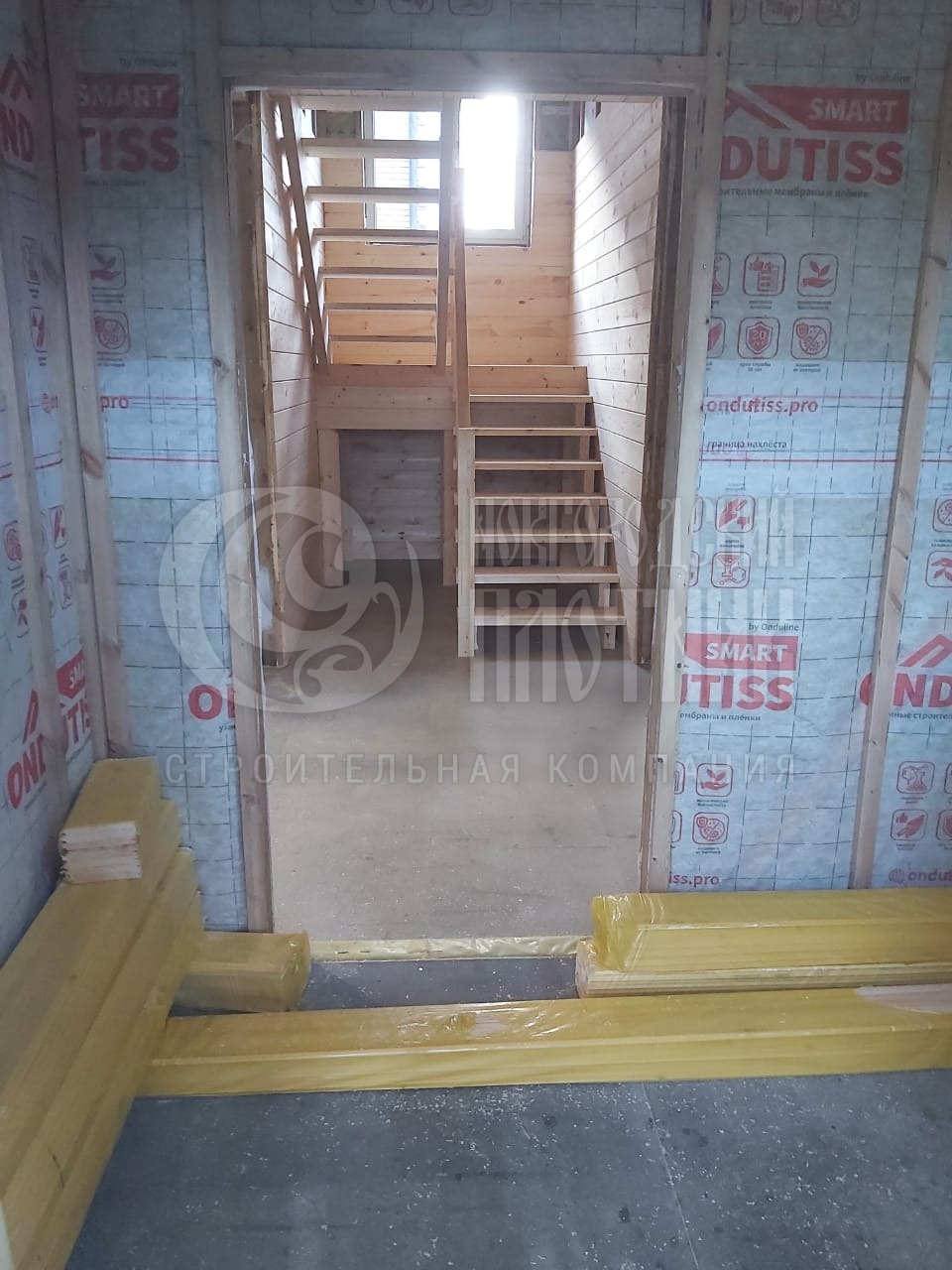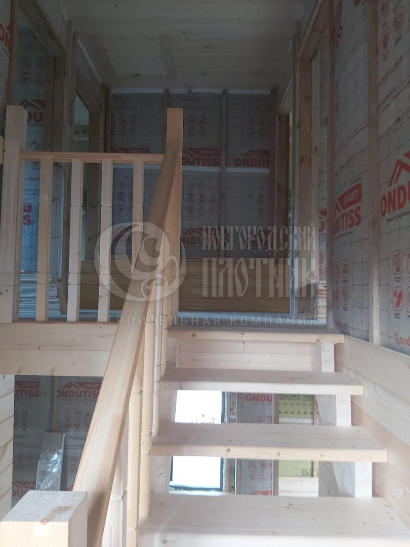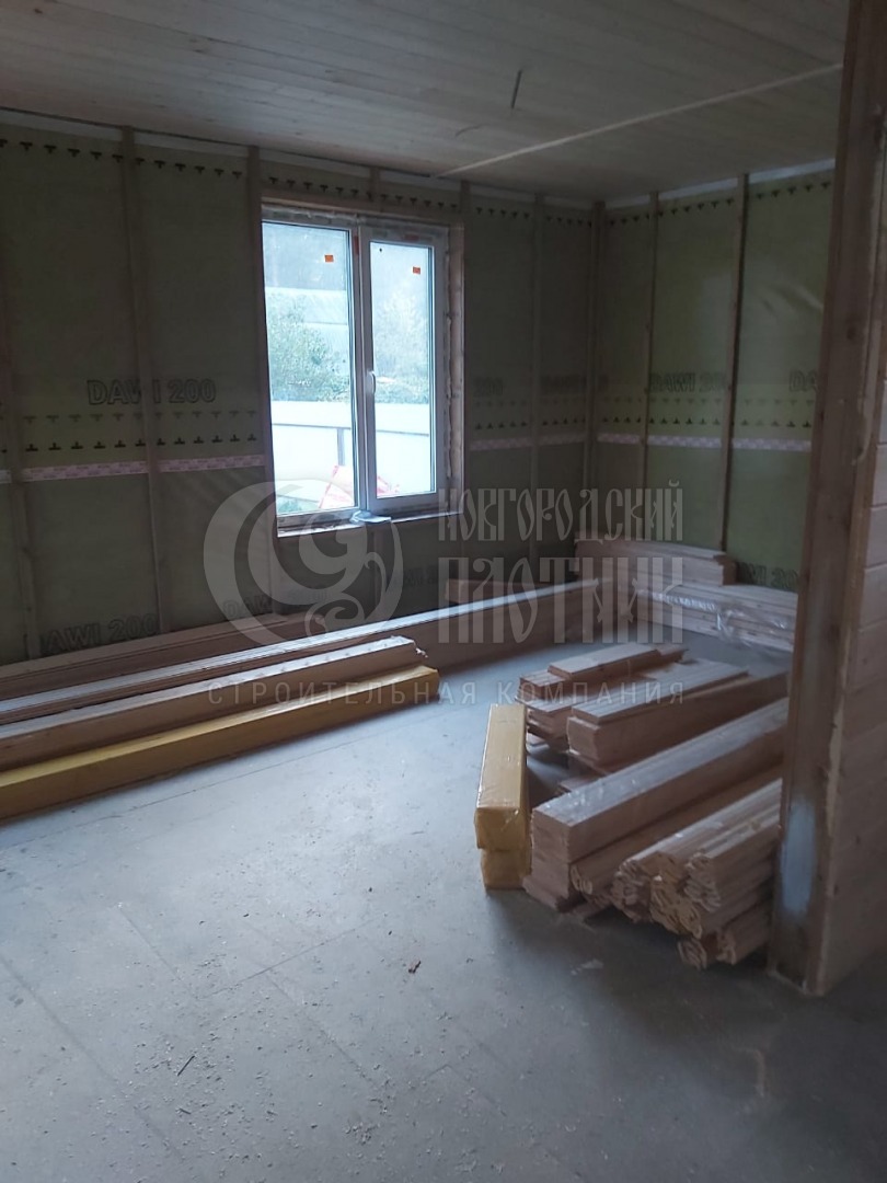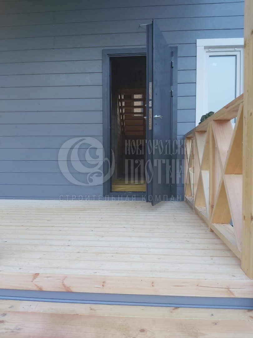 Сухой строганый каркас толщиной 200мм: снаружи имитация бруса в заводской покраске, внутри имитация бруса (по просьбе заказчика напилена, но не прибита, для проведения скрытых коммуникаций). Утепление стен, полов и потолков - Роквул 200мм. Потолки - вагонка камерной сушки 16мм. Окна ПВХ выполнены под заказ. Входная дверь утепленная с терморазрывом.