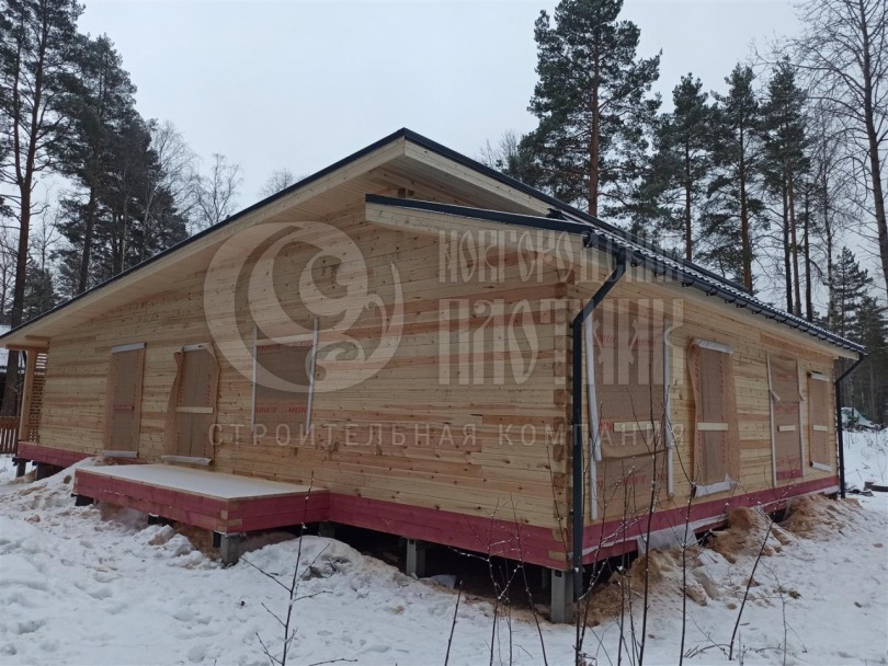 В декабре 2023г. завершилось строительство брусового дома по индивидуальному проекту Заказчика. Стены выполнены из профилированного бруса 140х140мм, перегородки из бруса 90х140мм. Сборка на деревянные нагеля. Крыша односкатная, разноуровневая, покрытие металлочерепица. Без окон и дверей. Чистовой пол - Квик-дек 16мм. Утепление полов - Роквул 200мм, потолков - Роквул 250мм. Дополнительно выполнена сушка бруса, антисептирована стропильная система и основание дома, на черновых полах установлена сетка от грызунов.