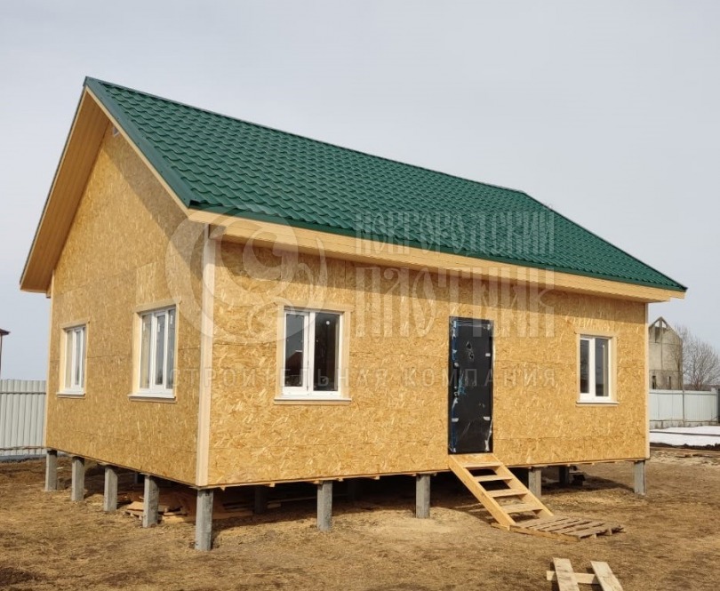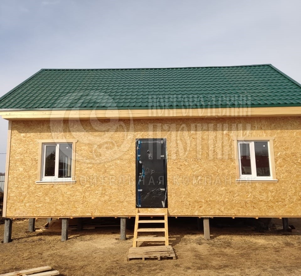 В марте 2022г построен одноэтажный дом по планировке заказчика. Каркас стен толщиной 150мм снаружи обшит ОСБ, внутри вагонкой. Утепление стен - каменная вата Роквул толщиной 150мм, полы и потолки утеплены в 200мм. Окна ПВХ двухкамерные. Кровля металлочерепица.
