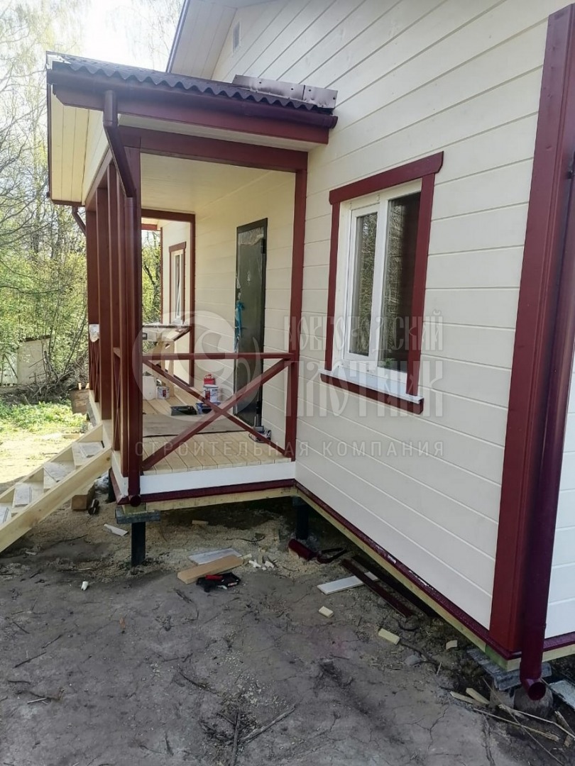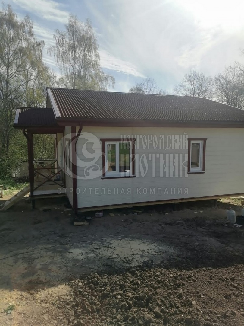 В мае 2022г. завершилось строительство одноэтажного дома на основе проекта Д-101. Размер дома был 9х9м, уменьшили на 1м (стал 8х9м). Каркас стен толщиной 150мм снаружи обшит имитацией бруса, внутри вагонкой, включая, потолки. Утепление стен, полов и потолков - каменная вата Роквул толщиной 150мм. Кровля ондулин. Окна ПВХ двухкамерные.