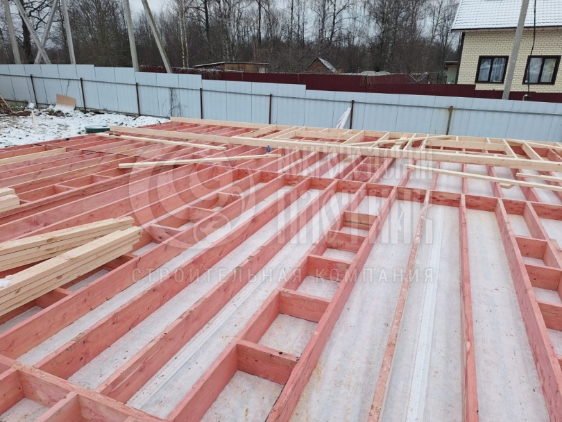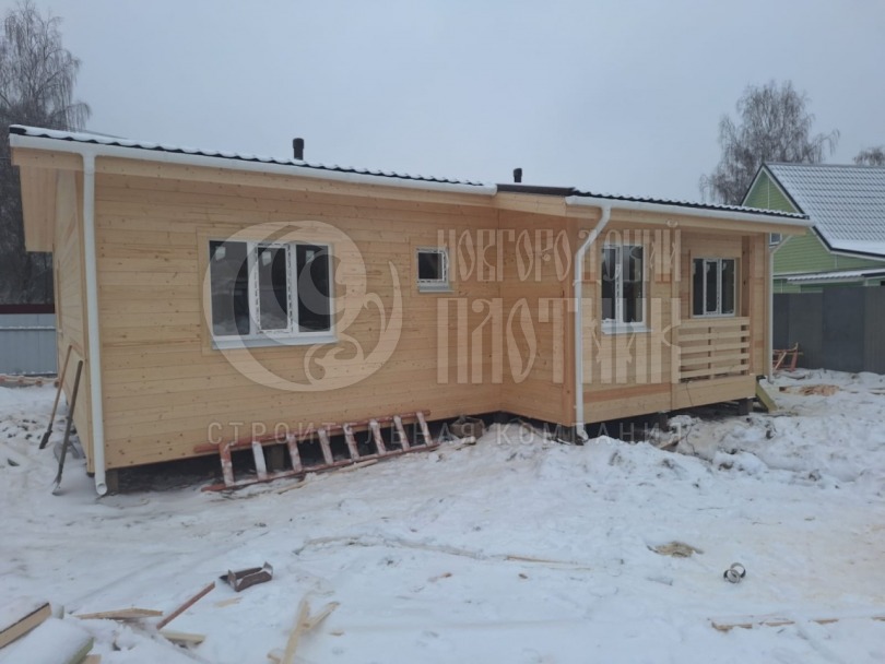 В декабре 2024г завершилось строительство каркасного дома по проекту Д-16 без террасы. Каркас стен 200мм выполнен из сухой строганой доски, снаружи и внутри обшит имитацией бруса, потолки вагонкой. Утепление стен, полов и потолков - Роквул 200мм. Окна ПВХ двухкамерные. Кровля металлочерепица. Дополнительно выполнено антисептирование основания.