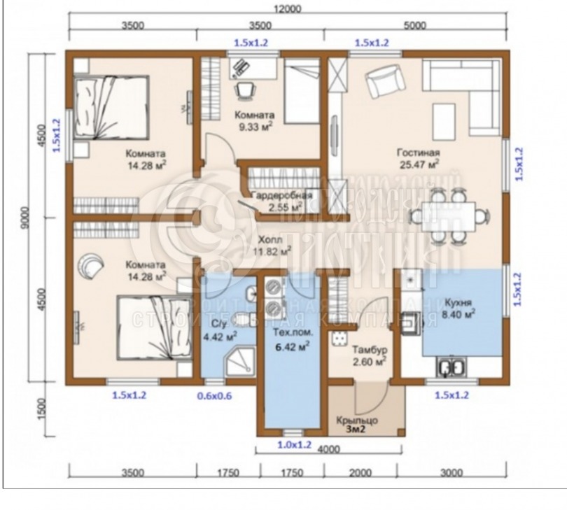 Одноэтажный каркасный дом 9х12м (проект Д-16)