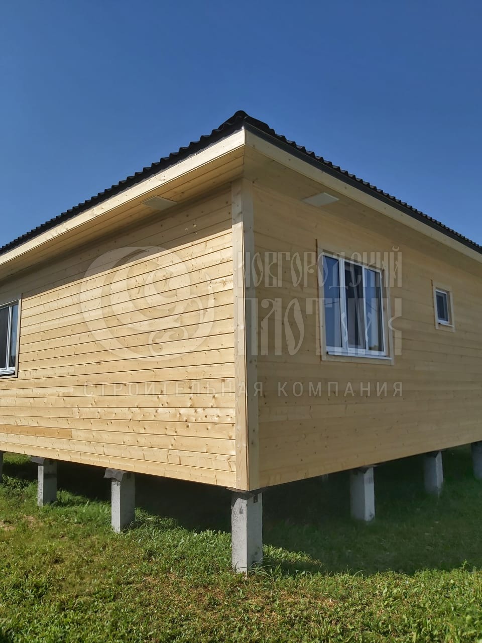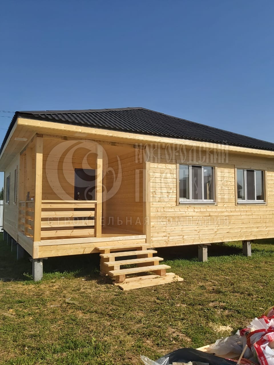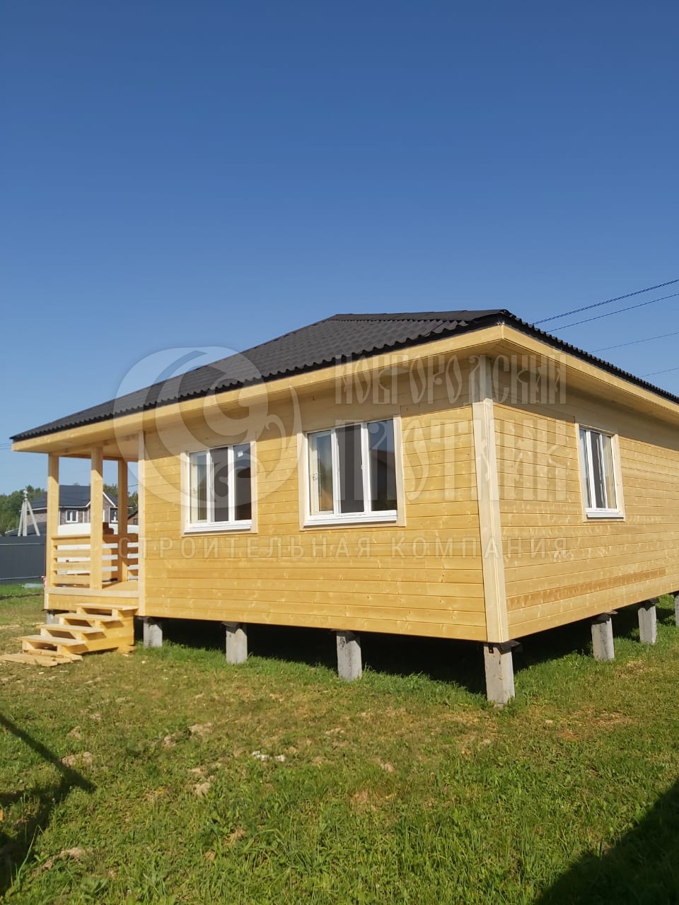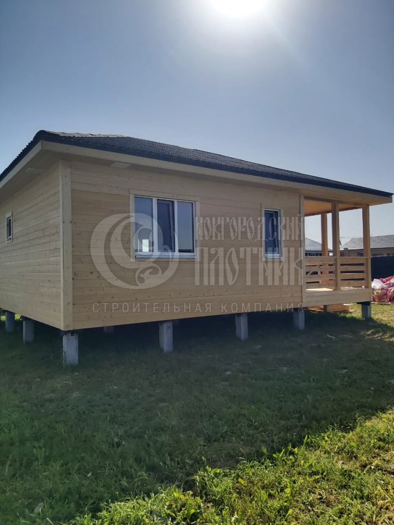 В июле 2025г завершилось строительство каркасного дома по проекту Д-1 с перепланировкой. Сухой строганый каркас снаружи обшит имитацией бруса, внутри вагонкой (в гостиной стены обшиты имитацией бруса). Утепление стен и потолка - Роквул 150мм, полы утеплены в 200мм. Кровля - ондулин "черепица".