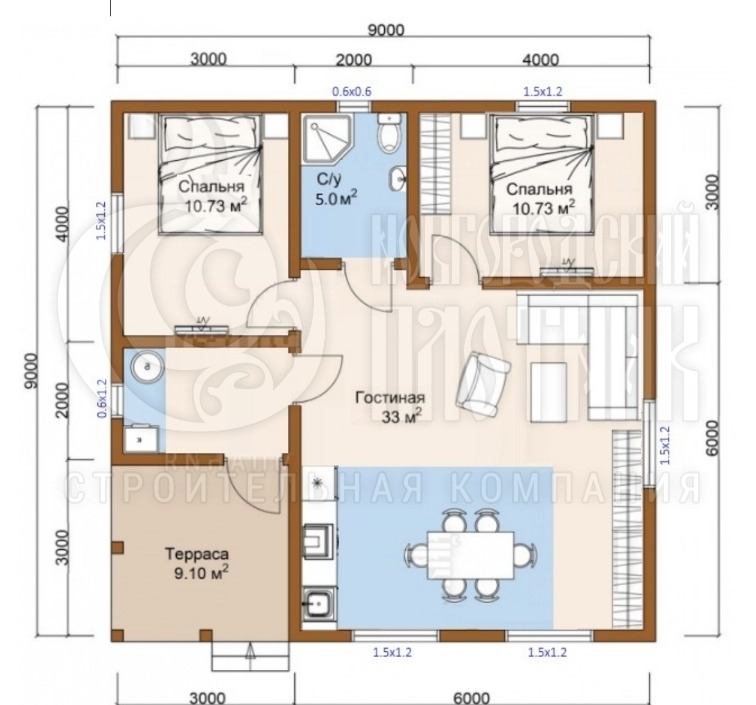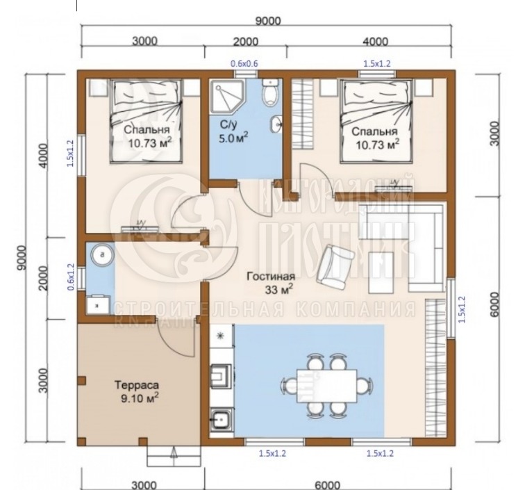 Одноэтажный каркасный дом 9х9м (проект Д-1)