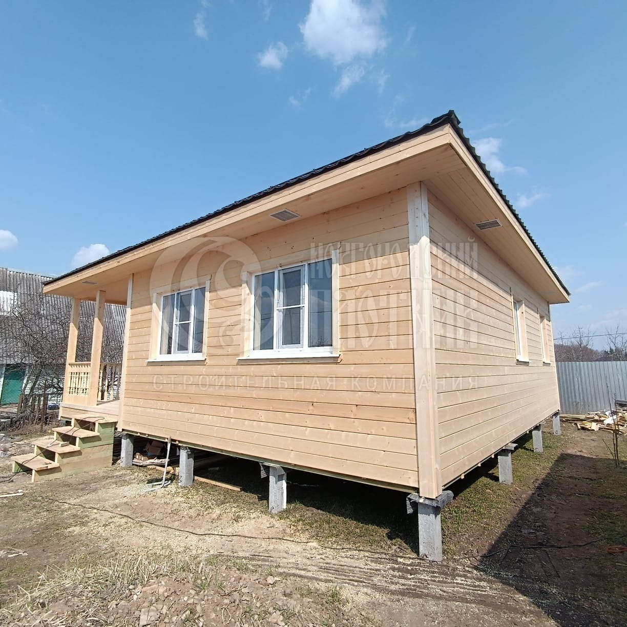 В апреле 2023г. завершилось строительство одноэтажного каркасного дома по проекту Д-1. Каркас дома толщиной 200мм снаружи обшит имитацией бруса, внутри вагонкой. Утепление стен, полов и потолков - Роквул 200мм. Крыша вальмовая, покрытие металлочерепица. Окна ПВХ двухкамерные.