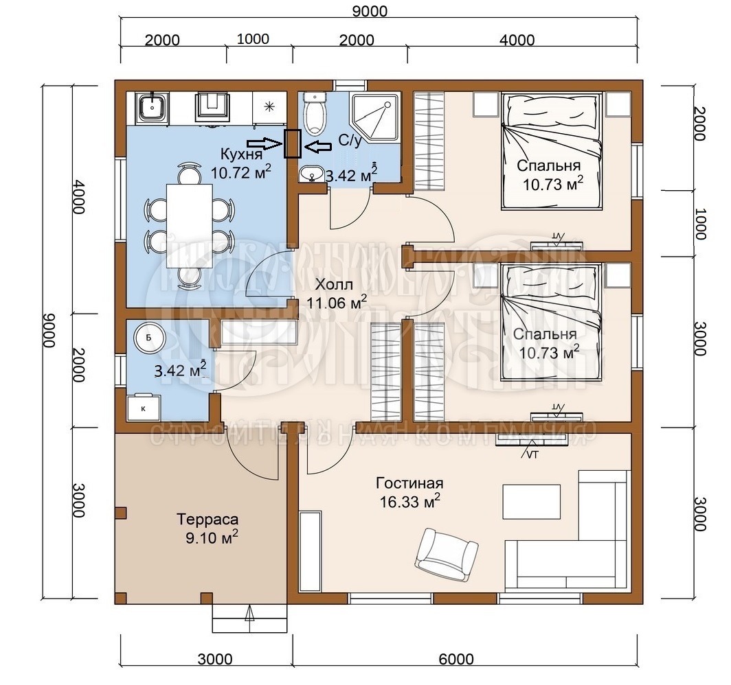 Одноэтажный каркасный дом 9х9м (проект Д-1)
